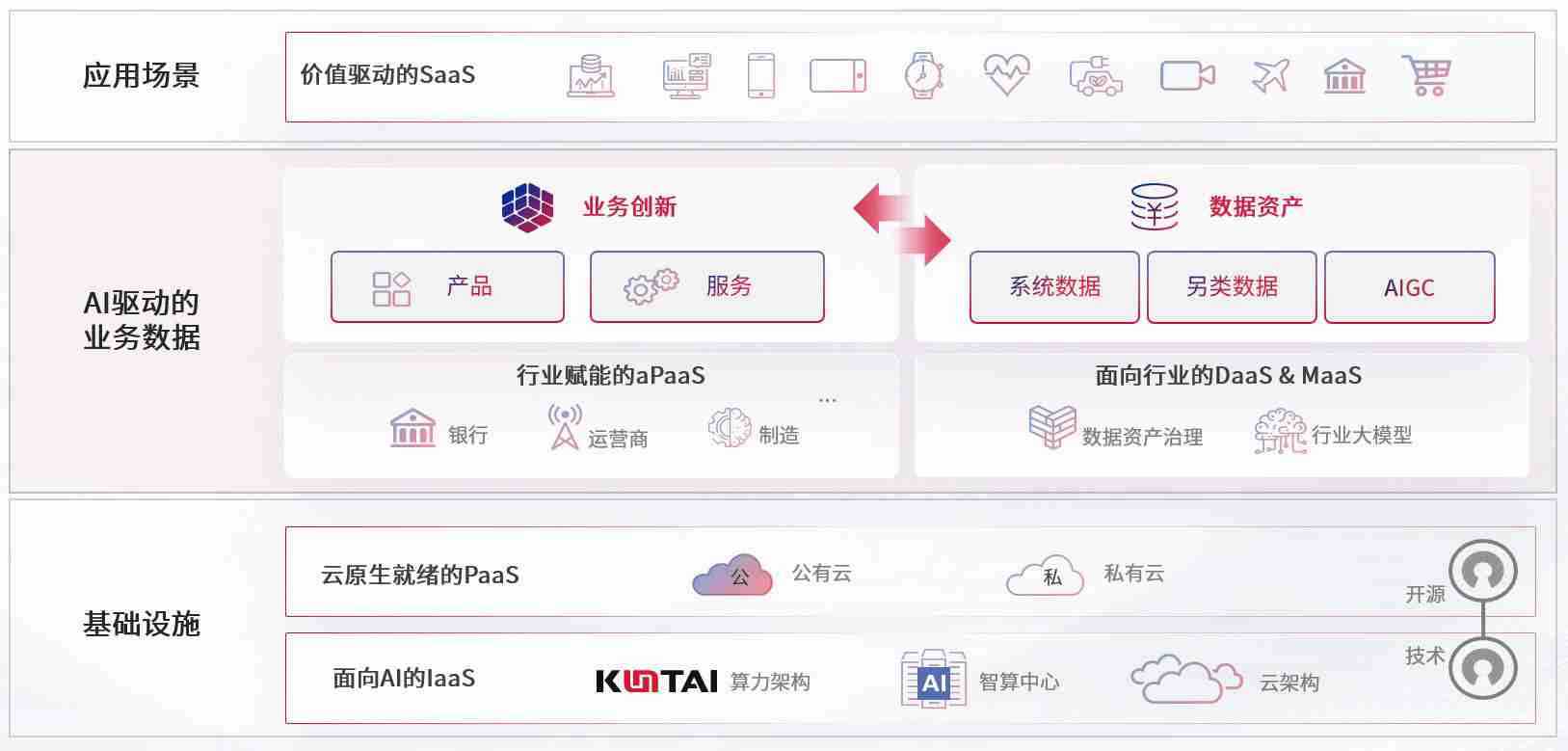 数字时代,,围绕企业数字化转型的关键要素,,,98858vip威尼斯游戏数码开创性的提出数云融合战略和技术体系框架,,,着力在云原生、、、数字原生、、、AI原生和信创产业上架构产品和服务能力,,,,为处在不同数字化转型阶段的快消零售、、、汽车、、金融、、、、医疗、、、政企、、、、教育、、、、运营商等行业客户提供泛在的敏捷IT能力和融合的数据驱动能力,,,,构建跨界融合创新的数字业务场景和新业务模式,,助力企业级客户建立面向未来的核心能力和竞争优势,,,,全面推动社会的数字化、、、、智能化转型升级。。