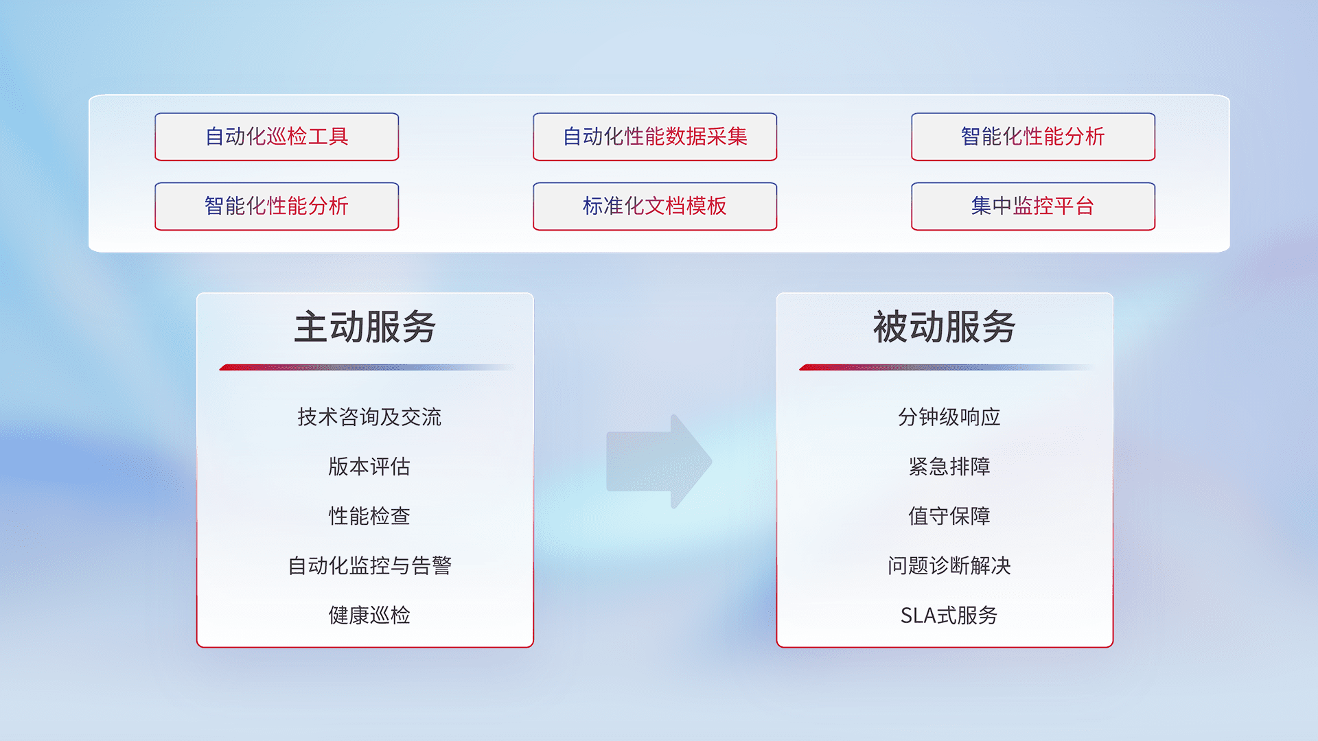 智能化工具和标准化文档,,保障服务质量,,,提供主动服务(包含技术咨询、、、、版本评估、、、性能检查、、、、自动化监控与告警、、、、健康巡检)和被动服务包含(分钟级响应、、、紧急排障、、、值守保障、、问题诊断解决、、、SLA服务)。。。